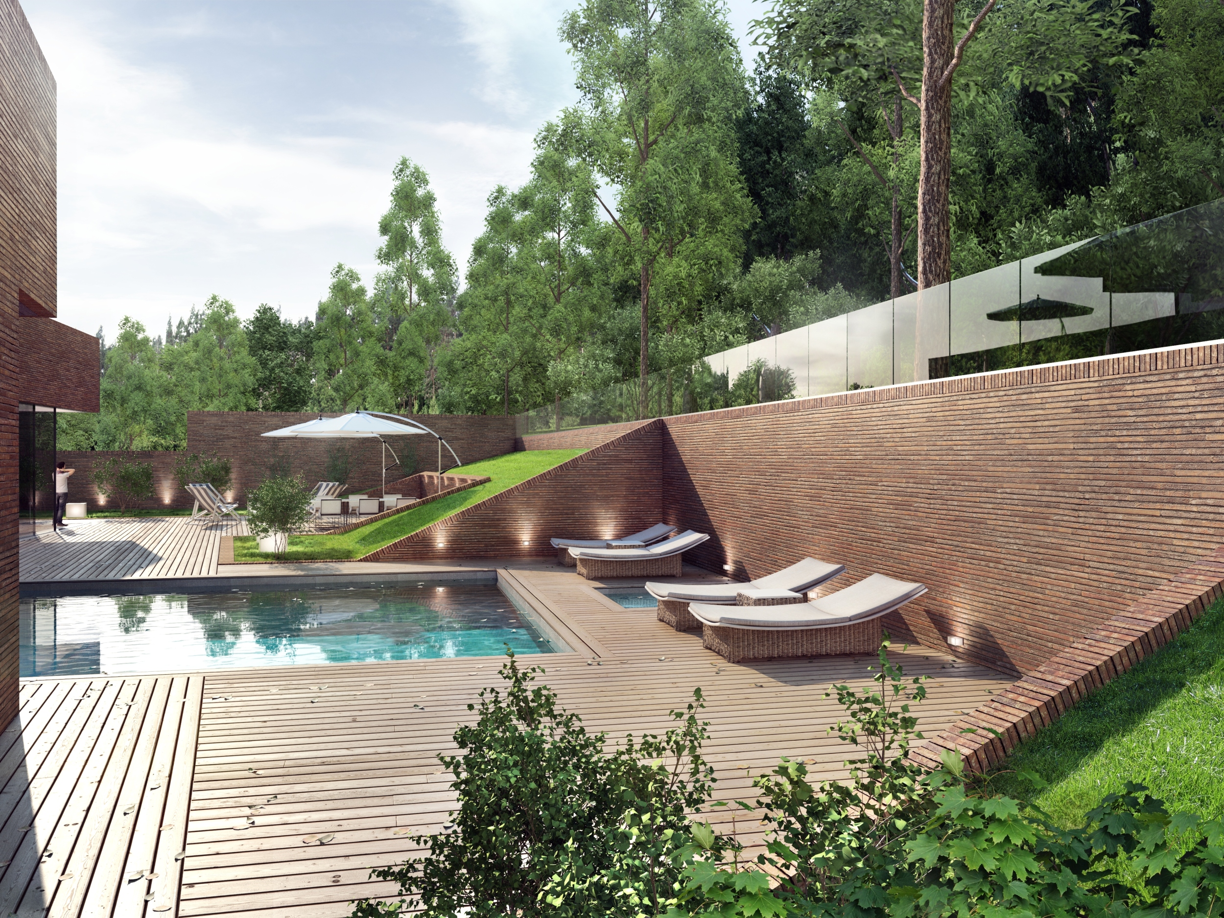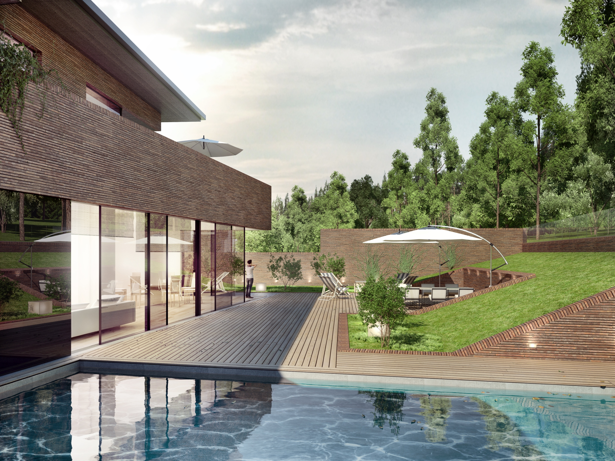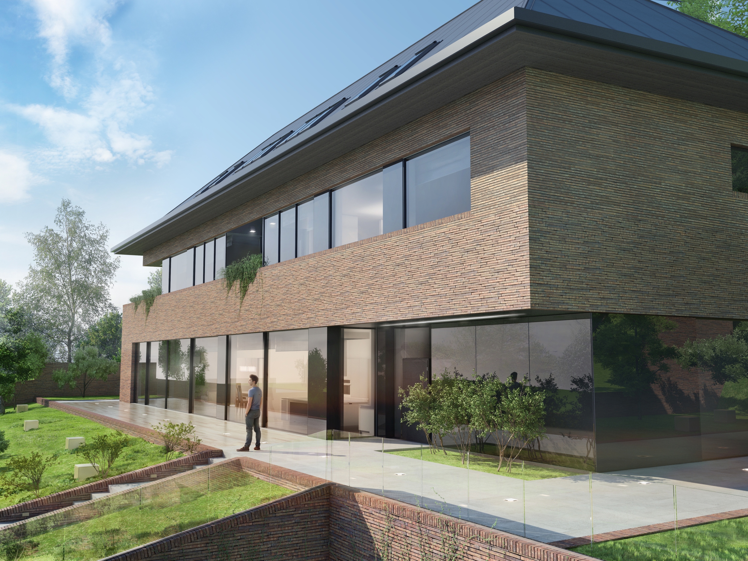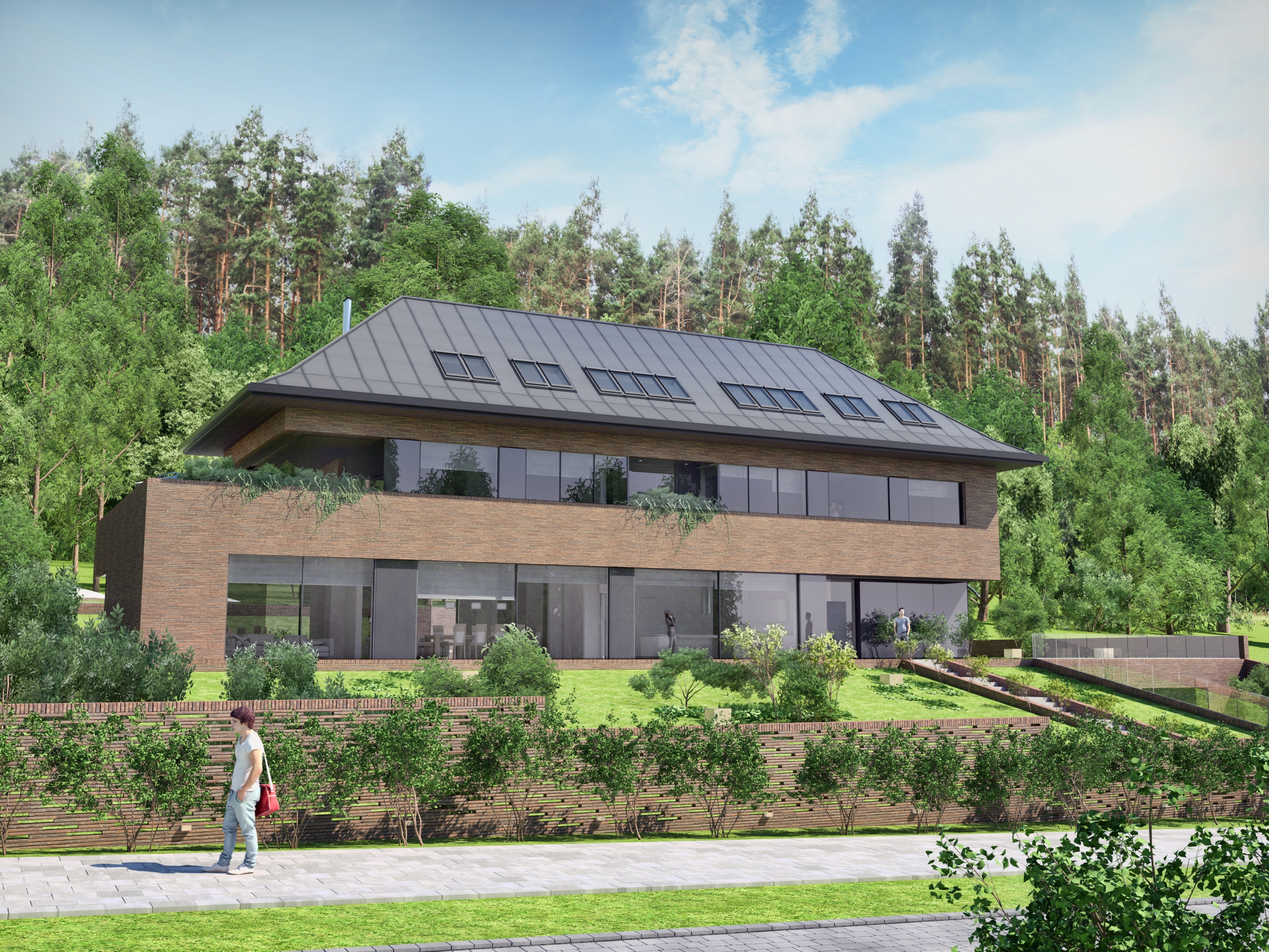Charakteryzuje się on elegancką bryłą o czterospadowym dachu oraz przestronnymi tarasami, harmonijnie współgrając z otoczeniem. W części podziemnej znajduje się przestronny garaż wielostanowiskowy oraz strefa spa. Przed budynkiem, od strony południowej zaproponowaliśmy przestronny ogród pozwalający wykorzystać w pełni atuty działki. Na piętrze znalazła się osłonięta loggia połączona z zielonym tarasem.